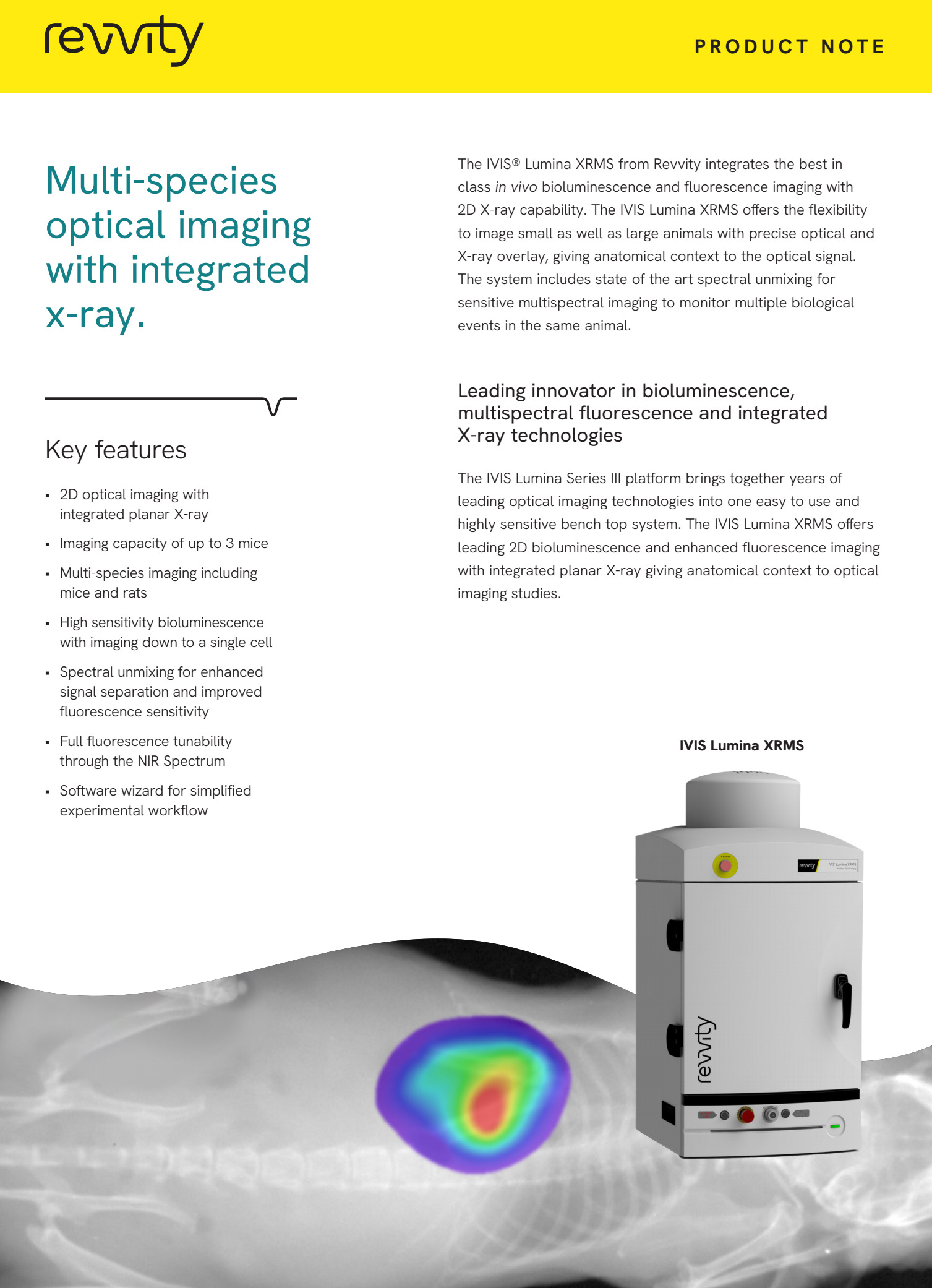 Aparat do przyżyciowego obrazowania zwierząt laboratoryjnych IVIS Lumina XRMS przeznaczony jest do badań dwuwymiarowych z zastosowaniem obrazowania luminescencyjnego, fluorescencyjnego oraz obrazowania promieniowania Cerenkova, a także RTG. Umożliwia to uzyskiwanie złożonych obrazów sygnałów fluorescencyjnych lub /i luminescencyjnych w kontekście obrazu RTG budowy anatomiczne zwierzęcia. Zaawansowana optyka, duży wybór filtrów wzbudzeniowych i emisyjnych, technologia Spectral Unmixing oraz wyposażenie dodatkowe takie jak dedykowany system anestezji gwarantują szerokie spektrum zastosowań aparatów IVIS Lumina XMRS zarówno w badaniach nad nowymi lekami, komórkami macierzystymi, rozwojem stanu zapalnego jak i w badaniach nad terapiami spersonalizowanymi. Standaryzacje badań gwarantuje możliwość absolutnej kalibracji zgodnej ze standardami NIST.