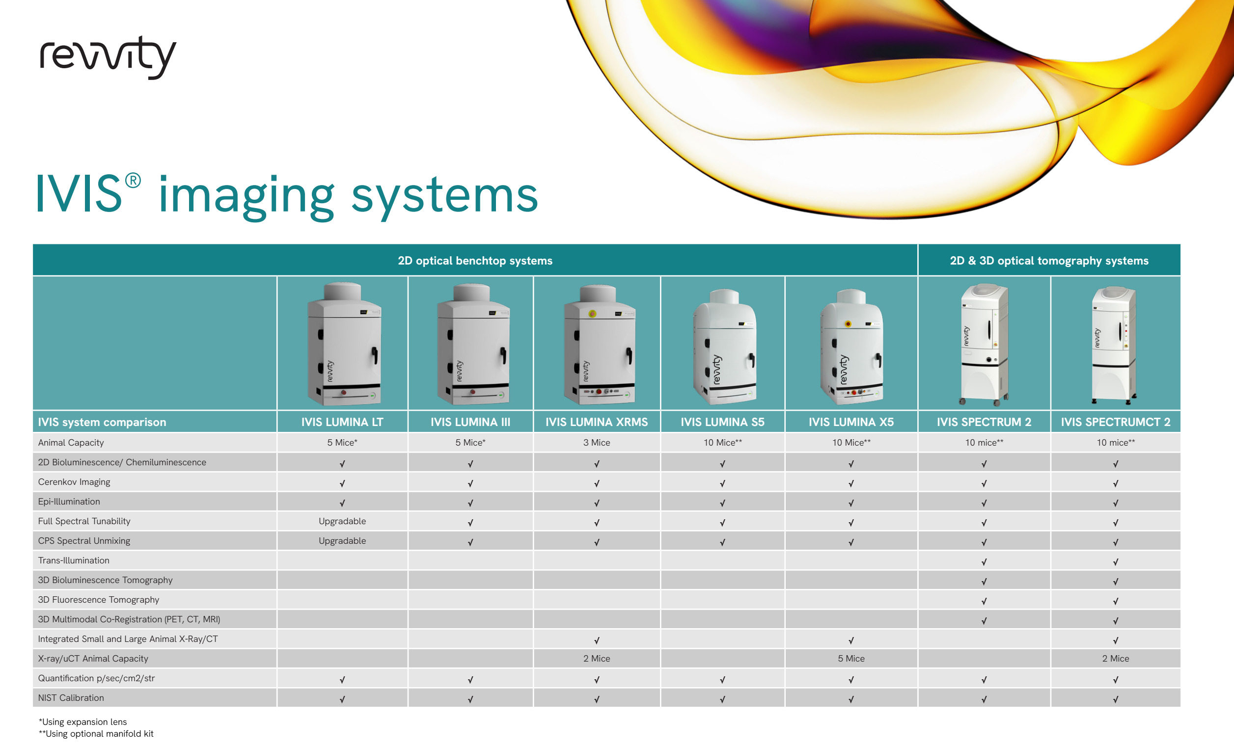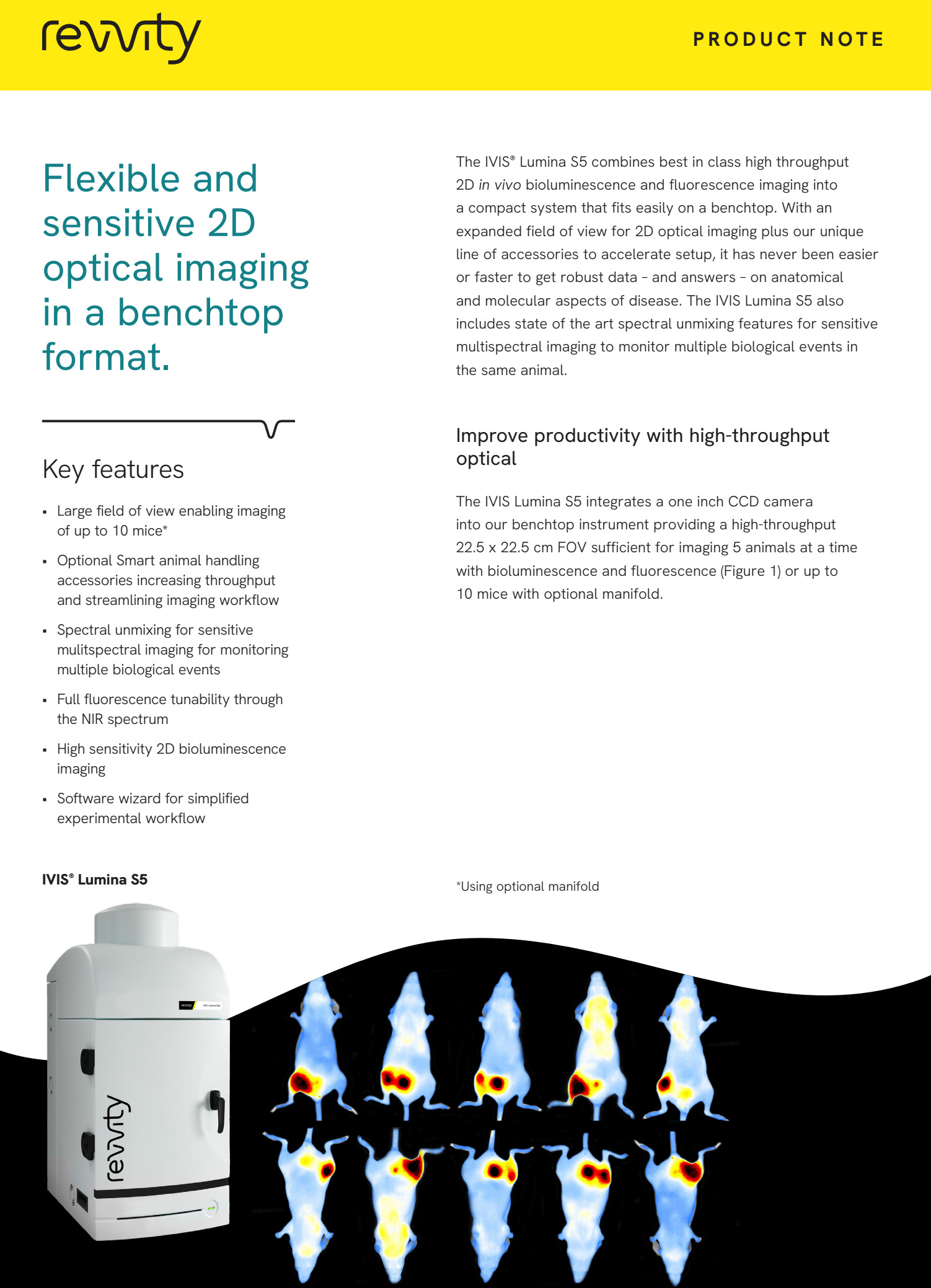 Aparat do przyżyciowego, wysokoprzepustowego obrazowania zwierząt laboratoryjnych IVIS Lumina S5 przeznaczona jest do badań dwuwymiarowych z zastosowaniem obrazowania luminescencyjnego, fluorescencyjnego oraz obrazowania promieniowania Cerenkova. Zaawansowana optyka, duży wybór filtrów wzbudzeniowych i emisyjnych, dostępna technologia Spectral Unmixing oraz wyposażenie dodatkowe takie jak dedykowany system anestezji czy system identyfikacji zwierząt gwarantują szerokie spektrum zastosowań aparatów IVIS Lumina S5 zarówno w badaniach nad nowymi lekami, komórkami macierzystymi, rozwojem stanu zapalnego jak i w badaniach nad terapiami spersonalizowanymi. Standaryzacje badań gwarantuje możliwość absolutnej kalibracji zgodnej ze standardami NIST.