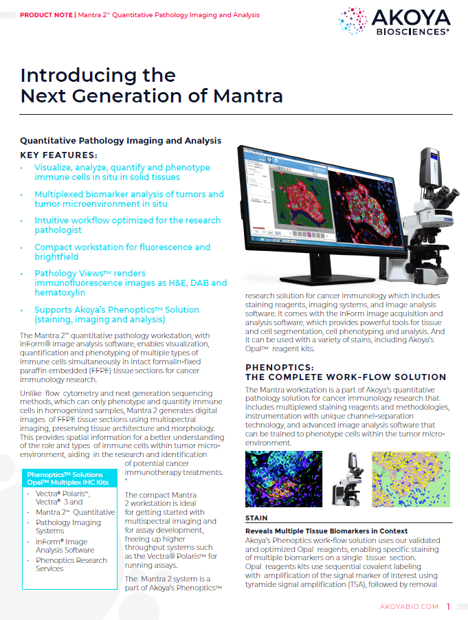 System manualnej mikroskopii fluorescencyjnej i jasnego pola Mantra 2 przeznaczony jest do symultanicznych, kwantytatywnych i fenotypowych analiz różnych typów komórek immunologicznych w parafinowych skrawkach tkankowych w badaniach immunologii nowotworów. Konstrukcja mikroskopu i oprogramowanie pozwalają na wieloparametrową analizę komórek immunologicznych w kontekście mikrośrodowiska tkanki nowotworowej, badanie ich wzajemnych oddziaływań oraz oddziaływań z nowotworem.