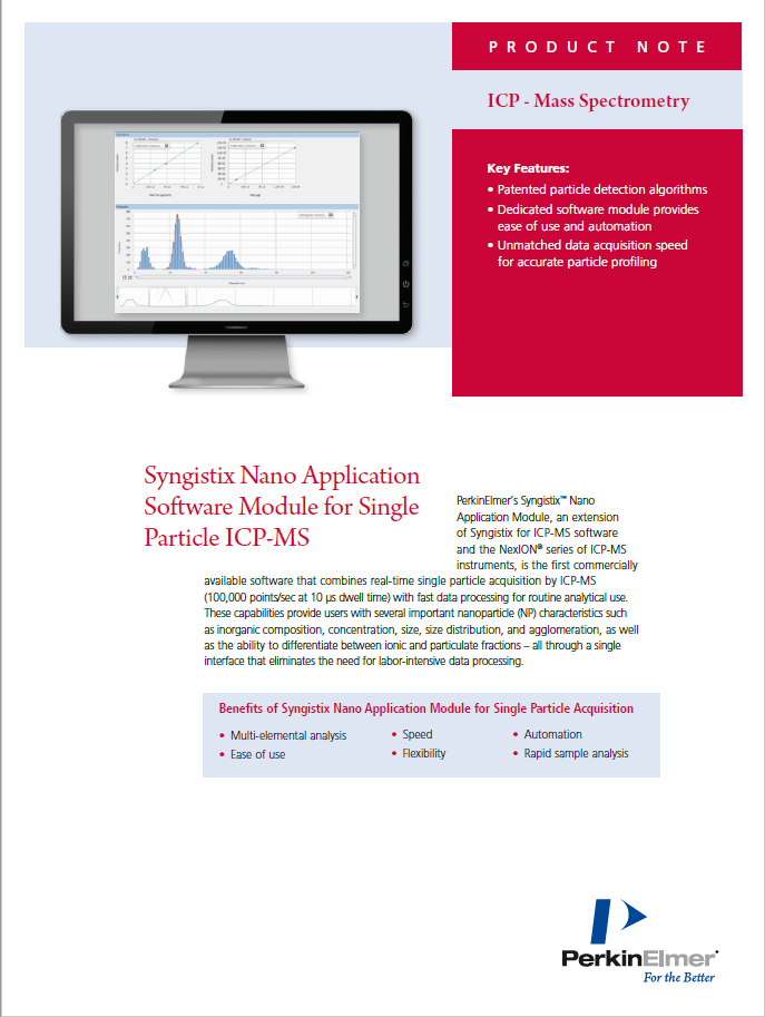 Moduł Syngistix Nano App to pierwsze na świecie oprogramowanie dedykowane analizie nanocząstek. Wykorzystuje opatentowane algorytmy do wykrywania w czasie rzeczywistym sygnałów pochodzących od nanocząstek różnych rozmiarów. Poza scharakteryzowaniem składu, stężenia, rozmiaru i dystrybucji rozmiarów oraz zdolności do aglomeracji, oprogramowanie pomaga również rozróżnić frakcje jonowe od cząsteczkowych, co pozwala ograniczyć czas potrzebny na wykonanie analiz.