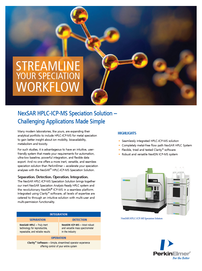NexSAR™ HPLC jest systemem nowej generacji, przystosowanym do analizy specjacyjnej – oznaczania form chemicznych pierwiastka w próbce. NexSAR może być podłączony do dowolnego spektrometru NexION, a cały system jest zintegrowany przez przez sprawdzone oprogramowanie Clarity™.