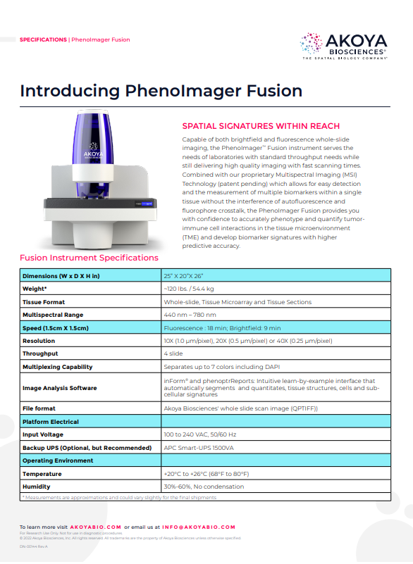 - jednoczesna analiza multispektralna do 7 fluorescencji w systemie PhenoImager lub 100+ markerów w systemie PhenoCycler – Fusion