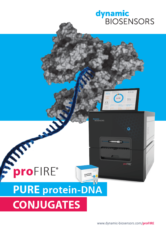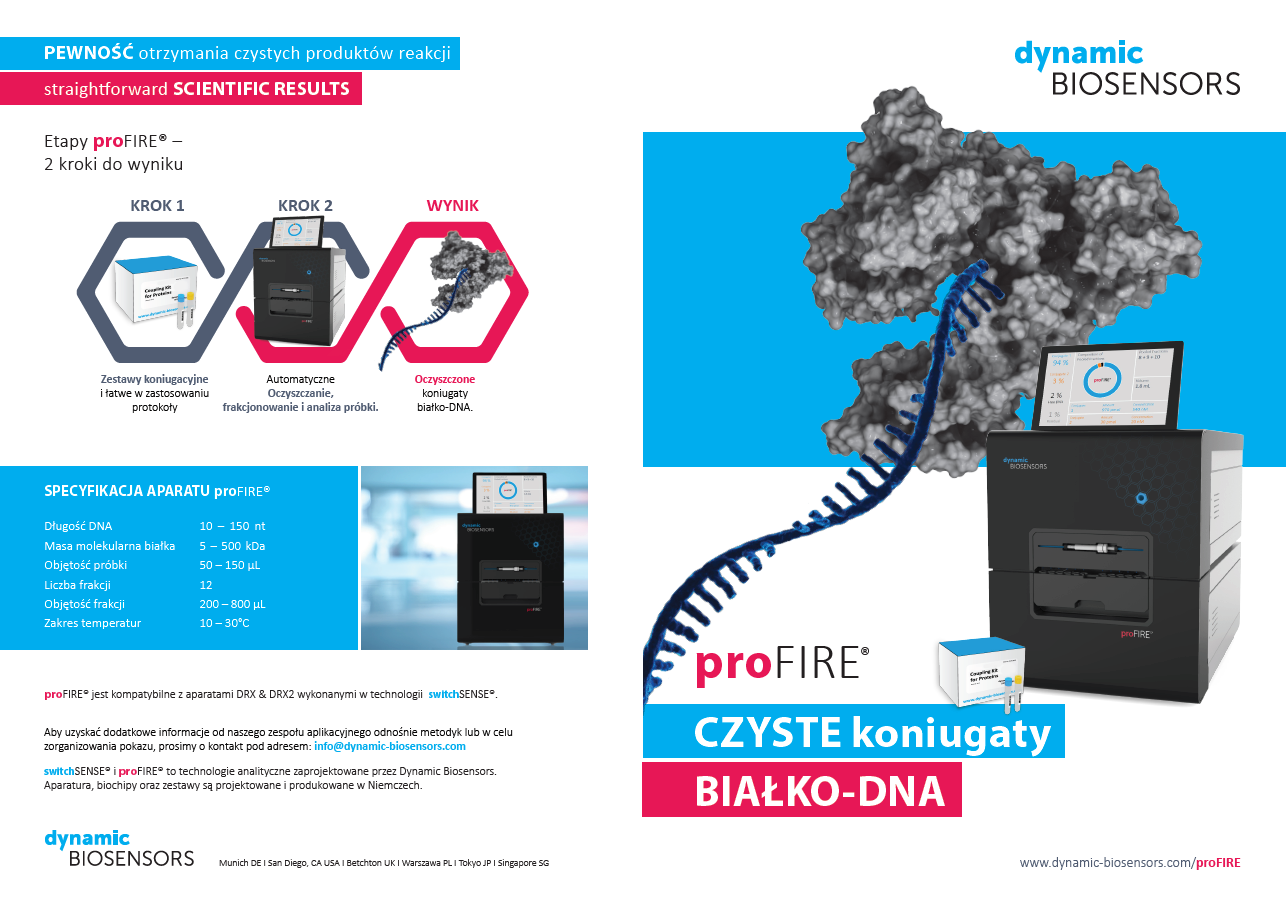 proFIRE® to wyjątkowy system do przygotowywania koniugatów białko-DNA, który umożliwia otrzymanie spójnych i poprawnych połączeń najwyższej jakości gotowych do dalszych eksperymentów. Tak uzyskane koniugaty wykorzystuje się m.in. do dalszych analiz z wykorzystaniem aparatów z serii heliX pracującymi w technologii switchSENSE®.